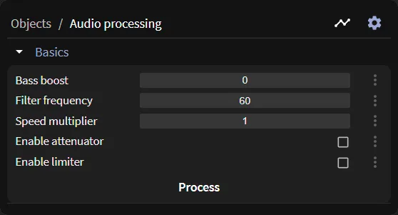 Did you know you can bass boost your audio without leaving the editor? Open the section mentioned above, increase the bass boost property, and click Process. You can also enable the limiter to prevent clipping.