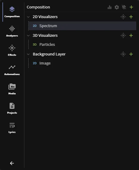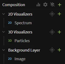 - Every layer has a button to quickly add an effect and an item to it. The add item button is the green one