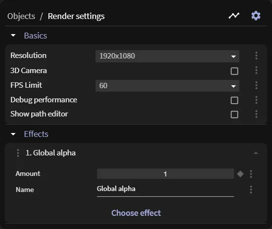 Here, you can change the resolution to more options, enable the 3D mode, set or unset an FPS limit to the preview, enable performance metrics, or enable the path editor. This is also where you add global effects to the entire screen.